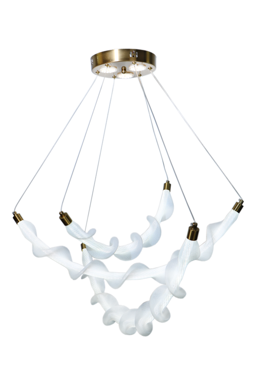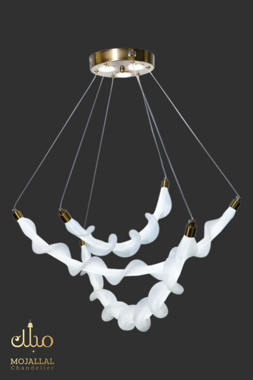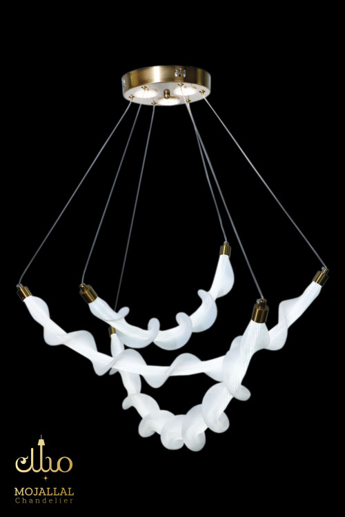 اولین چیزی که در مدل 3832 خودنمایی میکند، ساختار ساختارشکنانه آن است. برخلاف لوسترهای کلاسیک که بر پایه تقارن استوارند، این آویز با الهام از فرم گیاه پیچک، خطوطی منحنی و پویا را به فضای شما میآورد. این نوع طراحی باعث میشود فضا بزرگتر و دلبازتر به نظر برسد؛ چرا که خطوط منحنی، چشم را در محیط حرکت میدهند.